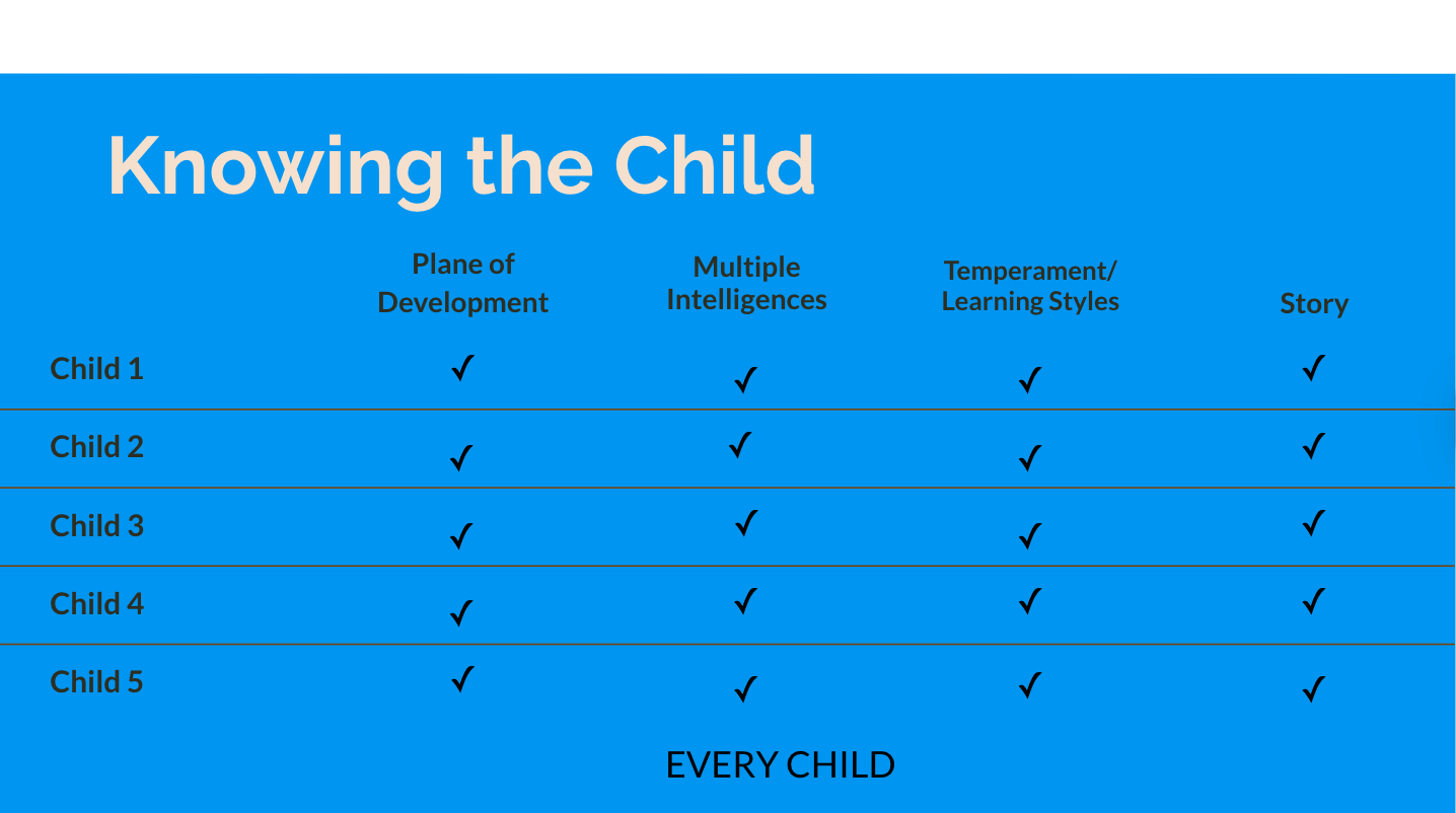 A holistic approach to understanding each child through their plane of development, multiple intelligences, personality, and individual story to guide responsive and meaningful experiences.