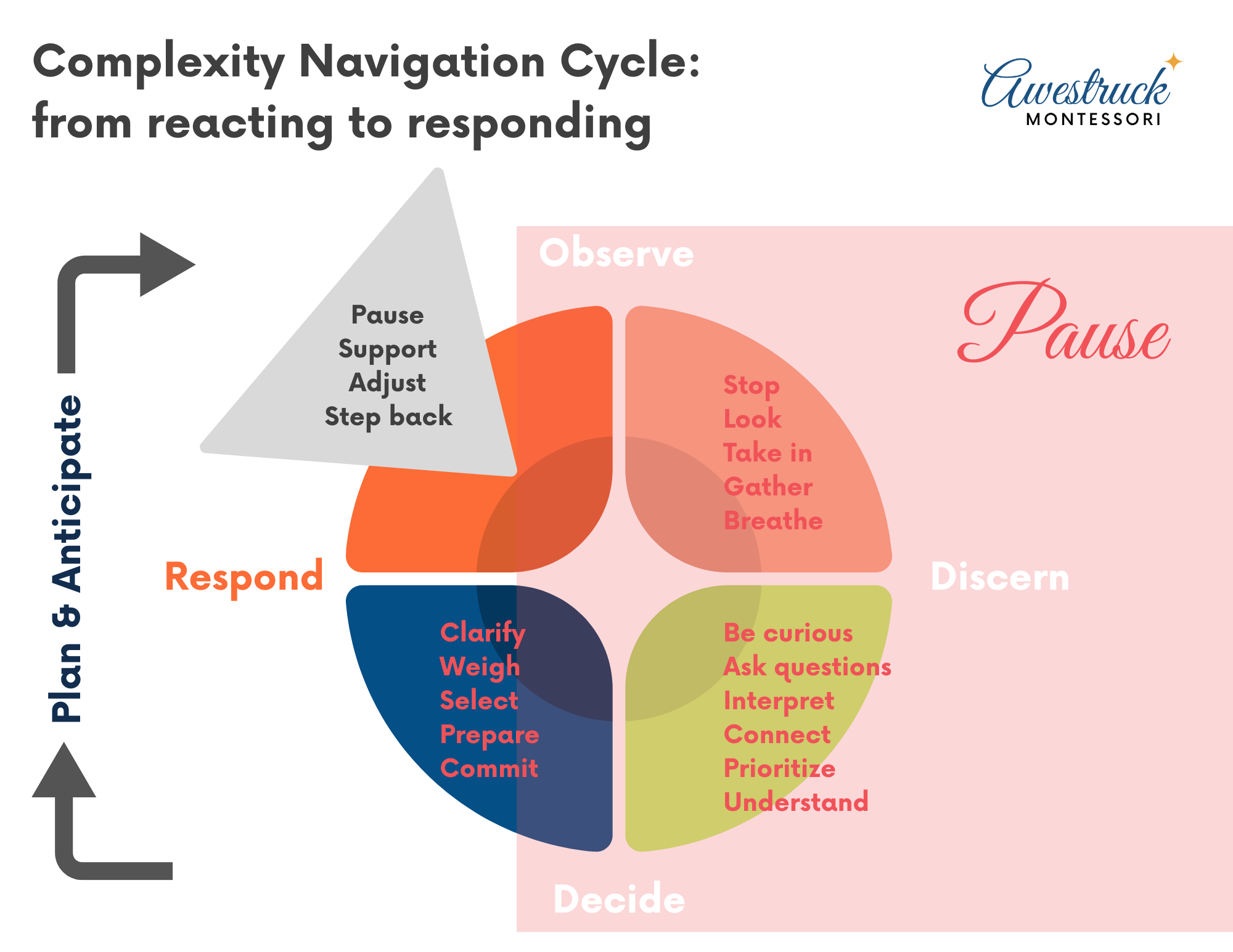 A reflective cycle for navigating complexity—observe, discern, decide, and respond—grounded in the pause that transforms reaction into an intentional response.